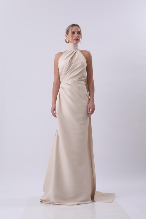 Athena Draped Halter Neck Maxi Dress – Champagne